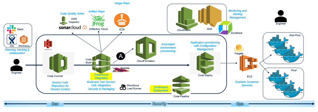 - Code Build & Pipeline: AWS provided fully managed CI tool providing build services to create artifacts by maven build and test. It also ensures quality gates by pointing to SonarQube instance. Alternative to Jenkins.