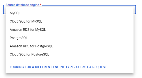 Google Cloud provide Database Migration Service for out-of-box migration of same or compatible database engines (homogenous) which are either MySQL or PostgreSQL based. We calls this Lift & Shift migration. Below figures shows the list of source database engines supported by Google Cloud Database Migration Service. Based on your selection of source the target data source will be selected automatically.