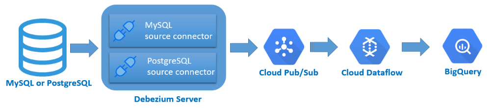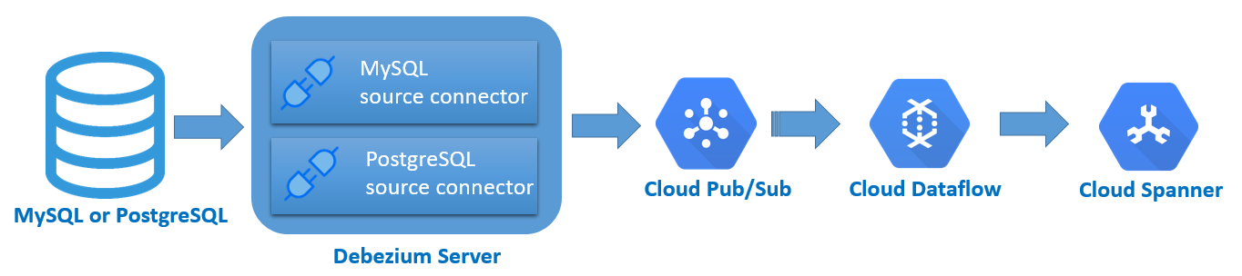 Debezium – Debezium is an open source distributed platform for change data capture. When using Debezium, one of the possible architecture is below (from Pub/Sub we can use Dataflow to push data to Spanner):