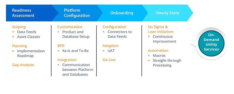 - Onboarding: We migrate the data, deploy the solution, validate the deployment, and align all the configurations. Post-integration, we configure connectors to the data feeds and then perform user acceptance testing before the go-live stage