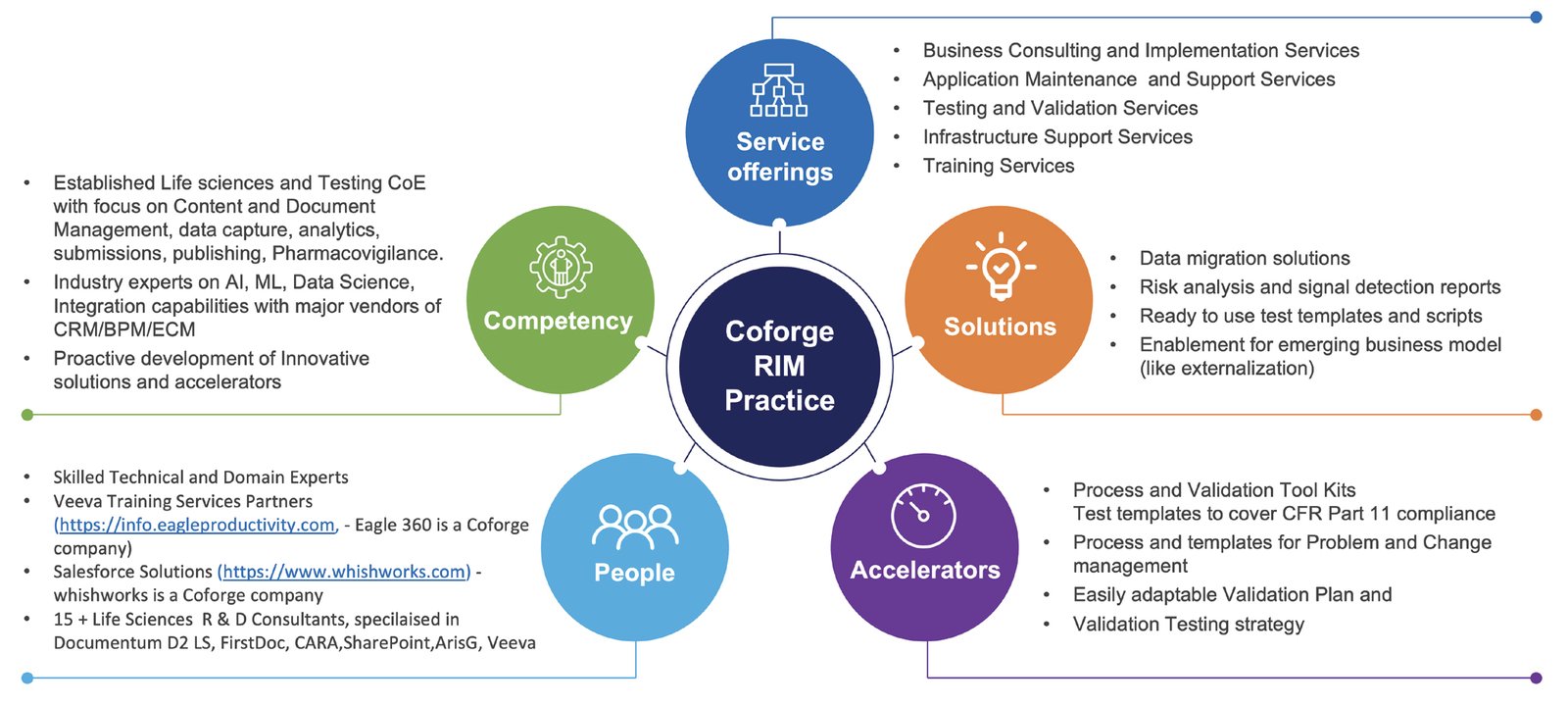 Regulatory Information Management: Coforge’s RIM practice is designed to deliver services that compliments the core product for a holistic coverage. Our resources are skilled and ready to be deployed, saving about 25% in ramp up time. There would be drastic reduction in cost on product training clubbed with quick and efficient transition. We also have ready to use solutions demanding minimum changes for a time and cost effective deployment. Our testing and validation accelerators can reduce the overall preparation and execution effort by about 25%.