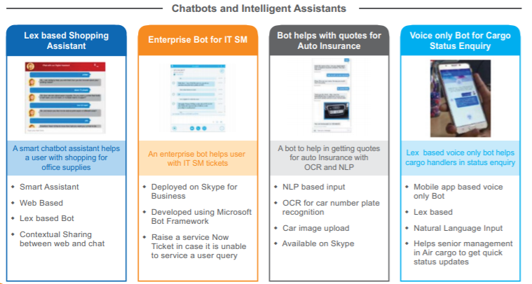 There are several other exciting possibilities in the areas of Banking & Financial services and Insurance as well. There are a number of banking and fintech companies deploying conversational and test-based Intelligent Agents in the areas of customer acquisition and matching appropriate loan products to the customer through easy, friendly and empathetic conversations. AI-infused Chatbots are also appearing in quote and claims areas of Insurance providers. Some of the interesting use cases in various key industries are illustrated below: