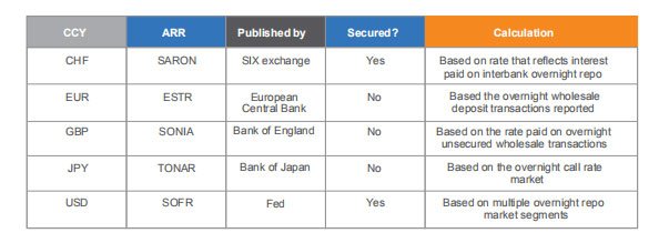 Since the financial crisis we have seen the increased use of alternate reference rates (ARR), also known as Risk Free Rates (RFR). These are all benchmarks based on active, liquid underlying markets; as such they address key concerns highlighted with LIBOR (i.e. the lack of underlying liquidity and ease of manipulation). The primary ARR’s are shown in table below.