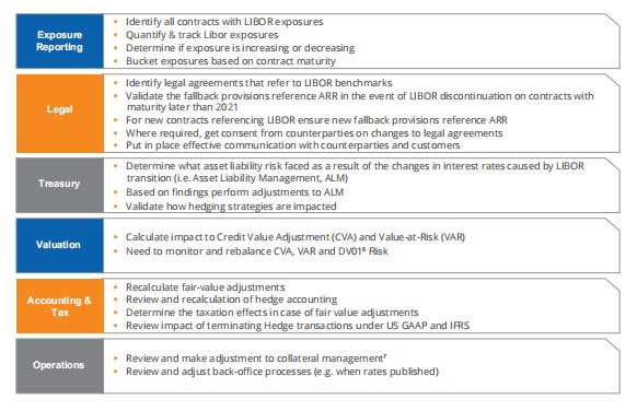 - LIBOR benchmarks are centrally managed whereas the ARR’s are managed by different intermediaries, each at different state of readiness; as such firms will have to handle both old and new based on the implementation timelines.