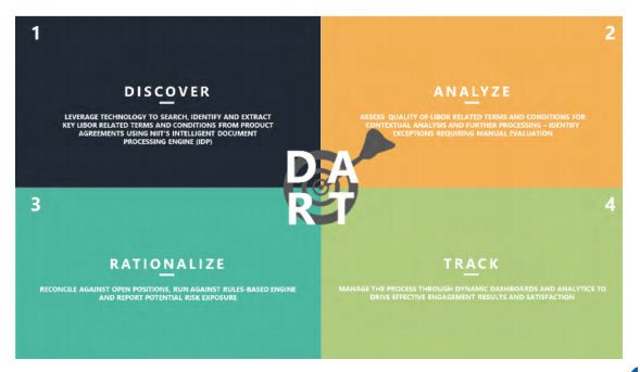 We have invested to ensure we can help our clients address the core challenges when handling their LIBOR transition. Our end-to-end DART assessment framework takes a technology centric approach to the problems. That is, we have used our own IP that leverages Natural Language Processing (NLP) and Artificial Intelligence (AI) along with partner Fintech products to build a holistic solution that can help clients.