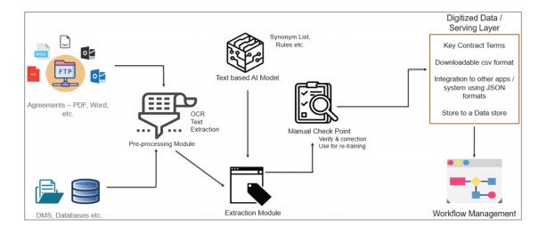 It contains a pre-processing module that houses the Natural Language Processing (NLP) and Optical Character Recognition (OCR) tools to efficiently extract text. The core module is a text-based Artificial Intelligence (AI) component that includes the synonyms list and rules database that routes data through a series of checkpoints to a digitized data servicing layer where the key contract terms are translated into downloadable formats and sent through intelligent workflows to a data repository.