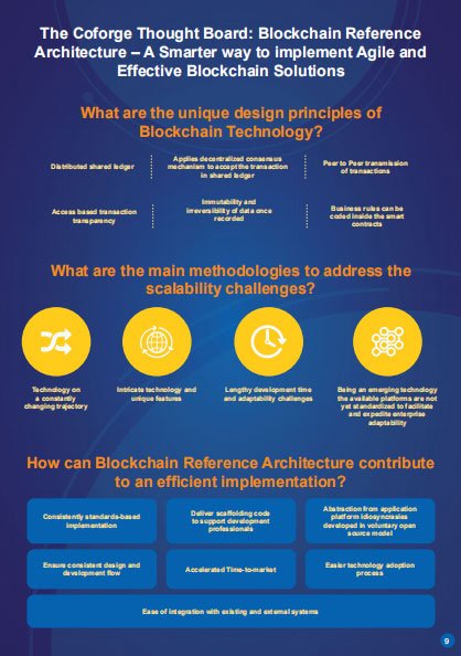 There is a lot of excitement around Blockchain technology these days as what was once dubbed as a maverick technology without a central authority is being adapted to benefit the mainstream businesses. There are a number of supporting technology elements that need to come together precisely to make this emerging technology quickly deliver business value. The technical skills and experience of the technical team also plays a decisive role in an implementation. The success of a typical implementation is likely to be a function of all these variables and hence, is likely to be unpredictable. A comprehensive business-ready Blockchain Reference Architecture offering along with pre-assembled Blockchain components from Coforge ensures unconditional success of a standards-based Blockchain implementation with minimal effort. With the reference architecture in hand, development teams can design and develop solutions to specific business problems without having to reinvent the wheel or losing time in experimentation.