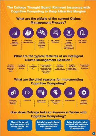 The industry is relentlessly marching towards cognitive computing worldwide and the insurance sector is at the forefront. Cognitive computing in effective Claims Management is making a huge difference to insurance carriers. With the help of machine learning, deep learning, image recognition, reasoning, and many other intelligent and cognitive automation technologies, cognitive computing is enabling smarter and faster decisions. It is making it possible to predict and prevent problems leading to faster complex and ambiguous task execution with high accuracy. Faster time-to-market, higher agent effectiveness, lower customer acquisition costs, improved sales, and enhanced delivery on the interaction and customer experience are the new realities for the insurance industry
