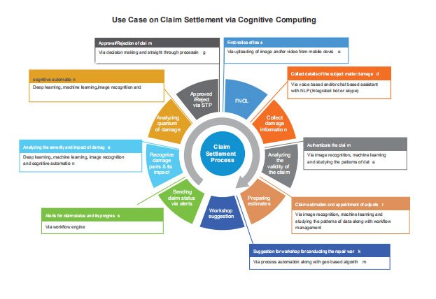 Cognitive computing in insurance, especially in the claims settlement process brings a highly effective solution to end-to-end claim processing raising operational efficiency along with the prospect of efficient AI-based prediction and self-remediation. It also enables smarter and faster decisions allowing insurance carriers to predict and prevent problems so that they can reap huge cost savings with a positive impact on their financial performance.