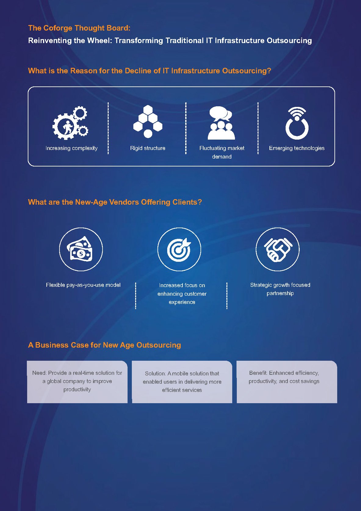 Traditional Infrastructure Outsourcing (IO) is on its decline with increasing levels of dissatisfaction among clients due to its complex structure and rigid Service Level Agreements (SLAs). Many companies, who signed long-term contracts with traditional infrastructure management vendors have expressed dissatisfaction on the vendor competency and ability to adapt to dynamic needs. This is driving the decline of traditional IO model and is encouraging businesses to invest in next-generation business partners who bring flexibility and agility to the table—in tune with evolving business dynamics.